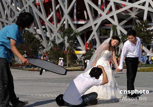 图:北京新人在奥林匹克公园内拍摄婚纱照