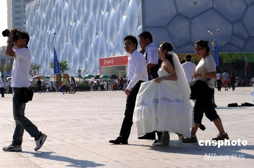 北京奥运接近尾声,一对新人在水立方外拍摄婚纱照片。中新社发 廖攀 摄