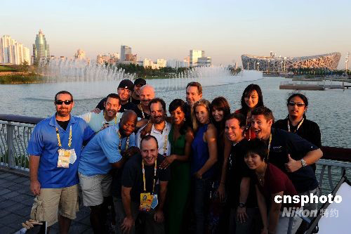 北京奥运接近尾声,美国NBC电视台等媒体记者合影留念惜别奥林匹克公园。中新社发 廖攀 摄