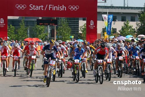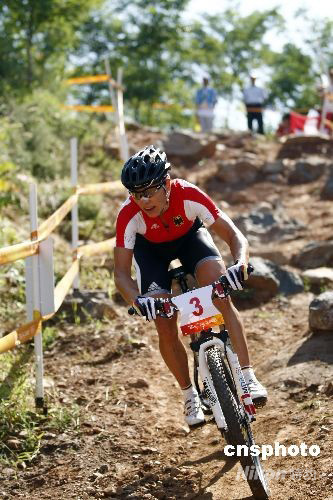 8月23日,北京奥运会自行车山地分项女子越野赛在北京老山山地自行车场举行。德国选手扎比内·施皮茨一路保持领先,最终以1小时45分11秒的成绩顺利摘金。波兰选手马娅·沃什佐夫斯卡获得银牌,俄罗斯选手伊琳娜·卡连季耶娃获得铜牌。中国选手任成远获得了第5名,另一位中国选手刘颖最终获得第12名。中新社发 盛佳鹏 摄