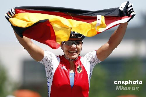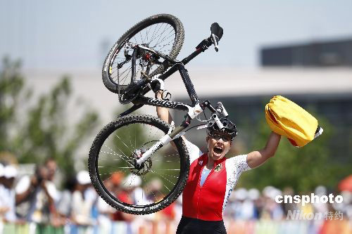 8月23日,北京奥运会自行车山地分项女子越野赛在北京老山山地自行车场举行。德国选手扎比内·施皮茨一路保持领先,最终以1小时45分11秒的成绩顺利摘金。中新社发 盛佳鹏 摄