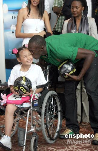 8月23日,北京奥运会田径一百米、二百米比赛金牌获得者牙买加运动员尤塞恩·博尔特亲吻来自汶川映秀镇因大地震受伤的小女孩黄思雨,并向她赠送一个签名足球。当天,博尔特在北京向中国红十字基金会捐赠善款五万美元,以支持中国红十字人道救助事业。中新社发 孙自法 摄