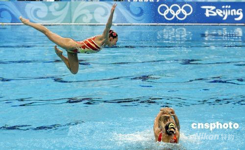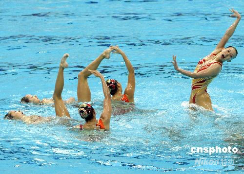 8月23日,北京奥运会花样游泳集体项目比赛结束,中国队以总分97.334分获得铜牌,实现了奥运会在这个项目上的突破。俄罗斯队凭99.500分获得金牌,西班牙队以98.251分夺得银牌。中新社发 杜洋 摄