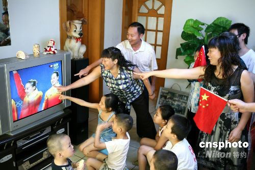 8月23日,四川阆中古城书院街一幢居民楼内,中国花样游泳队选手王娜的亲朋围在电视机旁观看北京奥运会花样游泳集体自由自选决赛。当日,中国花样游泳队夺得团体自由自选铜牌,这是她们在奥运会历史上获得的首枚奖牌。