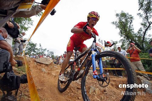 8月23日,在北京老山山地自行车场进行的奥运会男子自行车越野赛中,中国选手姬建华名列第22位。中新社发 盛佳鹏 摄