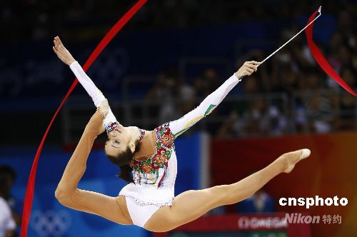8月23日晚,在北京工业大学体育馆举行的北京奥运会艺术体操个人全能决赛中,乌克兰选手加娜·别兹索诺娃获得铜牌。图为加娜·别兹索诺娃在比赛中。 中新社发 盛佳鹏 摄