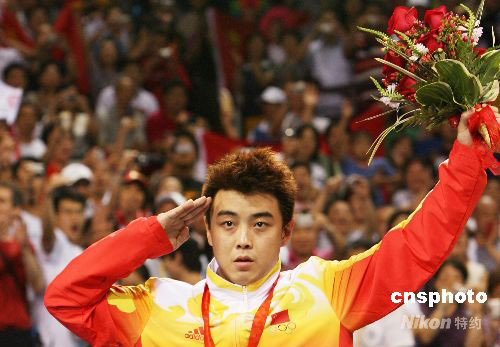 8月23日晚,王皓在北京奥运会乒乓球男子单打决赛中以1:4负于队友马琳,夺得亚军。图为来自解放军队的王皓在领奖台上向观众行军礼致谢。 中新社发 武仲林 摄