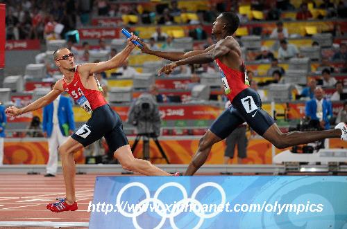 8月23日,美国队选手杰里米·韦林纳(左)从队友戴维·内维尔手中接棒。当日,美国队在北京奥运会男子4X400米决赛中以2分55秒39的成绩夺得金牌并打破奥运会纪录。新华社记者 李尕 摄