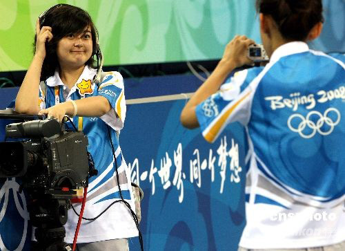 8月24日,北京奥运会闭幕日,在北京五棵松篮球馆服务了1个多月的大学生志愿者们,清晨到篮球场内拍摄珍贵的留念照。北京奥运会的赛会志愿者大多数是北京地区的在校大学生,他们的整体服务受到与会者的高度评价。中新社发 任晨鸣 摄