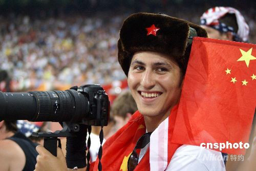 8月23日晚,在国家体育场“鸟巢”的观众席上,一位伊朗小伙子头戴“雷锋”帽,一边拍照片,一边狂热地为比赛选手助威。当现场有观众问他姓名时,他微笑着用中文回答“雷锋”。中新社发 马小刚 摄