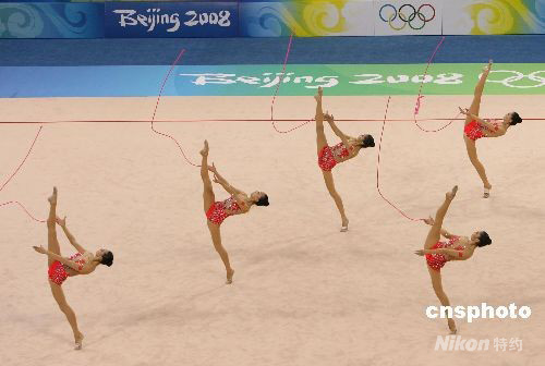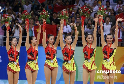 8月24日,中国艺术体操队在北京奥运会艺术体操集体全能决赛中夺得银牌,取得历史性突破。中新社发 武仲林 摄