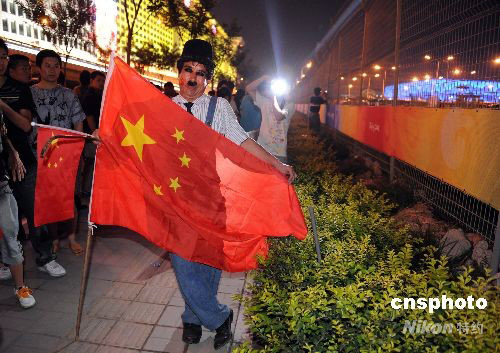 北京奥运会进入尾声,奥林匹克公园外人流不减,一位市民扮演喜剧明星“卓别林”。中新社发 廖攀 摄