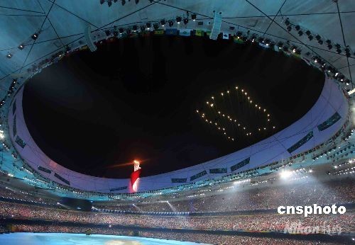 8月24日晚,第二十九届夏季奥林匹克运动会在北京闭幕。盛大闭幕式开始,鸟巢焰火齐放,焰火图案数字从29开始倒计时,最后一个数字“0”用拉手花束炸开一个滚动的、火红的圆圈,圆圈周长长达600米,相当于围绕鸟巢碗口“跑”一圈。中新社发 任晨鸣 摄