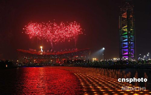 图:北京奥运会闭幕式开始 烟花映照“鸟巢”
