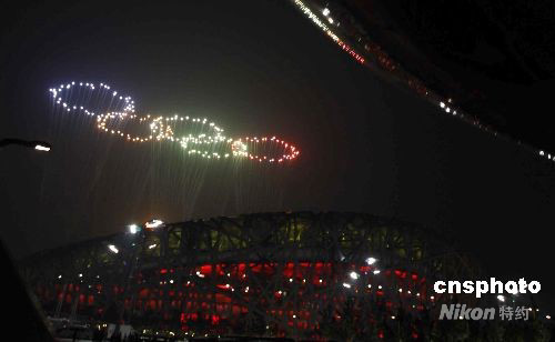 8月24日晚,第二十九届夏季奥林匹克运动会在北京闭幕。闭幕式上燃放的彩色“五环”焰火独特新颖。 中新社发 盛佳鹏 摄