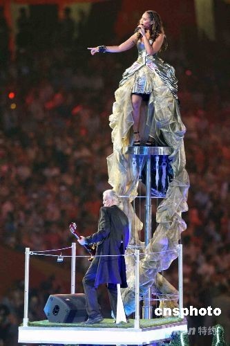8月24日晚,北京奥运会闭幕式在奥林匹克公园内的国家体育场举行,下届奥运会主办地伦敦市在“鸟巢”上演伦敦8分钟节目,在英国大型选秀节目“XFactor”中脱颖而出的偶像歌手利昂娜·刘易斯与英国著名摇滚乐队“齐柏林飞船”的主音吉他手吉米·佩齐联袂献歌;还有英国民歌、都市街舞、Hip-Hop霹雳舞等表演。中新社发 任晨鸣 摄