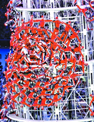 陈维亚说,2006年11月11日,闭幕式团队刚刚成立,最初的创意中就有这么一个“塔”,这是从苗族的踩刀梯表演中获得的灵感。最早的设想是用搭梯子方式进行,由于存在安全隐患而放弃。最后,主创人员找到了现在的形式,就是由人去攀登“记忆之塔”。396人徒手攀登,更加直观地体现了拼搏精神。