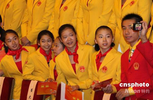 8月26日,2008年北京奥运会中国体育代表团总结大会在北京人民大会堂金色大厅举行。女子体操运动员参加北京奥运会中国体育代表团总结大会。 中新社发 廖文静 摄
