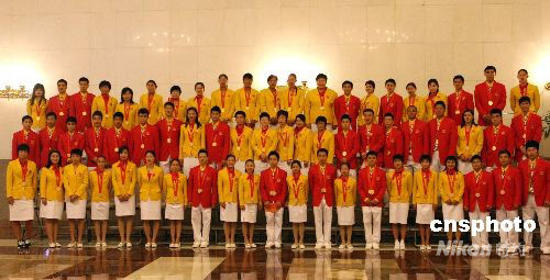 8月26日,2008年北京奥运会中国体育代表团总结大会在北京人民大会堂金色大厅举行。图为北京奥运会中国体育代表团金牌选手合影。中新社发 廖文静 摄