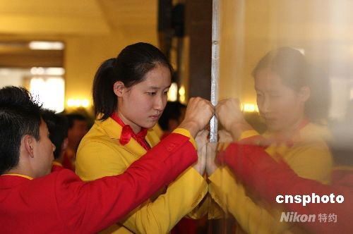 8月26日,2008年北京奥运会中国体育代表团总结大会在北京人民大会堂金色大厅举行。图为同参加总结大会的刘子歌为李小鹏签名留念。中新社发 廖文静 摄