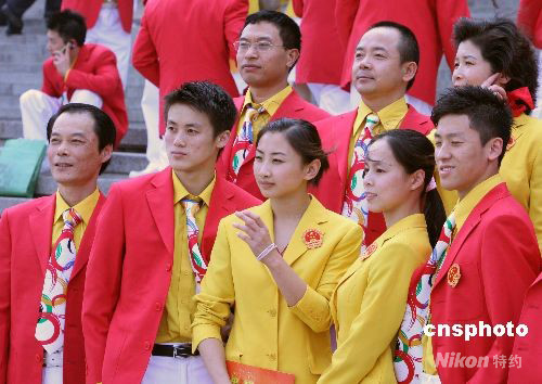 8月26日,2008年北京奥运会中国体育代表团总结大会在北京人民大会堂金色大厅举行。中国蹦床运动员参加北京奥运会中国体育代表团总结大会。 中新社发 廖文静 摄
