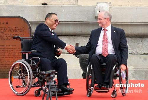 8月28日上午,北京残奥会圣火采集暨火炬接力启动仪式在北京天坛举行。国际残奥委会主席菲利普·克雷文(右)与全国政协副主席、中国残联主席、北京奥组委执行主席邓朴方出席。中新社发 张宇 摄
