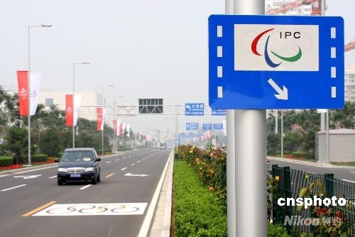 2008年8月28日,北京23条残奥会专用车道分为6个时段陆续启用。从27日晚开始,北辰西路的残奥会专用车道上出现了“IPC”标志。 据悉,残奥会专用车道总长209.9公里,比奥运会专用车道缩短了70多公里,其中东二环部分路段等7条道路成为今天首批投入使用的残奥会专用车道。中新社发 吴芒子 摄
