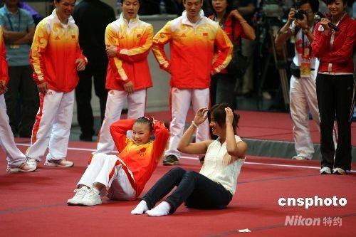 北京奥运会内地金牌运动员代表团在香港伊丽莎白体育馆作示范表演,并与青少年同乐。中新社发 洪少葵 摄