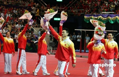 杨威、邹凯、李小鹏、肖钦、黄旭、陈一冰等选手与香港观众近距离接触。他们的精彩表演,博得全场热烈的掌声。中新社发 洪少葵 摄