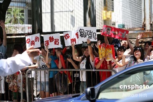 北京奥运会内地金牌运动员代表团在香港伊丽莎白体育馆作示范表演,大批 “粉丝”在场外苦候,希望一睹金牌选手风采。中新社发 洪少葵 摄