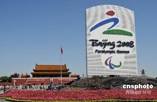 9月1日,北京2008年残奥会会徽“天地人”屹立在北京天安门广场。会徽以天、地、人和谐统一为主线,把中国的文字、书法和残疾人奥林匹克运动精神融为一体,集中体现“心智、身体、精神”和谐统一的残疾人奥林匹克运动精神,具有深厚的中国传统文化底蕴。残奥会开闭幕式将分别于9月6日和17日晚8点在北京的国家体育场“鸟巢”举行。中新社发 王宇婷 摄