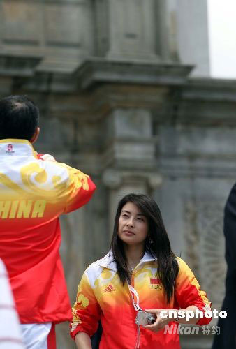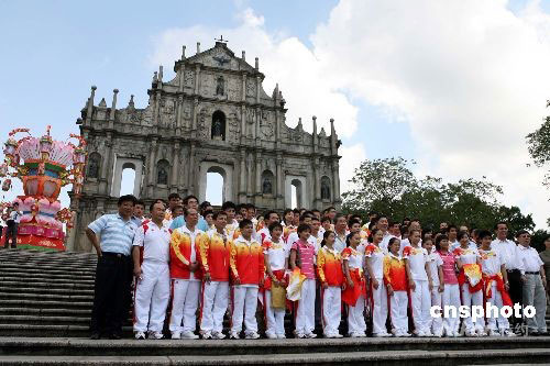 九月一日上午,在澳门访问的北京奥运内地金牌运动员代表团一行来到著名景点大三巴游览,兴高采烈地合影。