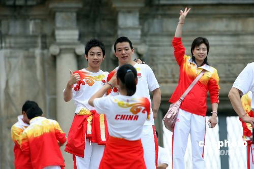 图为国家举重队龙清泉、张湘祥等在景点合影。中新社发 洪少葵 摄