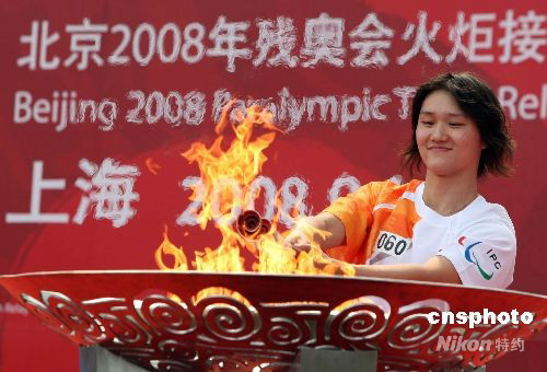 九月一日,北京残奥会火炬接力“时代风采线”第三站传递活动,在上海松江新城大学园区进行,共有六十名火炬手参加。其中,残疾人员有10名,其余为助残、帮残的先进代表和基层残疾人事业工作者。在北京奥运会游泳比赛中获得一银两铜佳绩的上海运动员庞佳颖,参加火炬接力活动。 中新社发 汤彦俊 摄