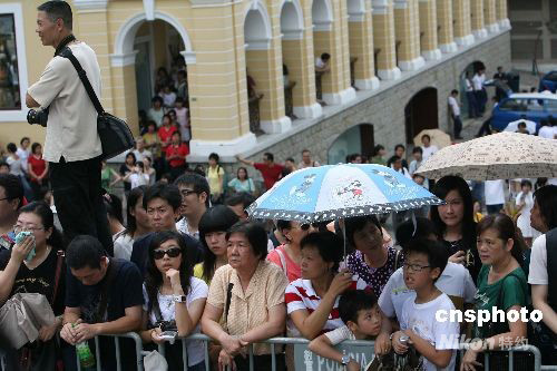 九月一日上午,北京奥运内地金牌运动员在澳门的第二日访问行程,到名胜大三巴游览,在牌坊前拍照合影。吸引大批市民一早到场等候,争睹运动员的风采。中新社发 洪少葵 摄