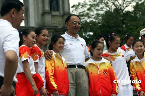 九月一日上午,北京奥运内地金牌运动员代表团在澳门展开第二日访问行程,代表团团长刘鹏与奥运女子体操团体金牌选手们在澳门著名景点大三巴前留影。中新社发 洪少葵 摄