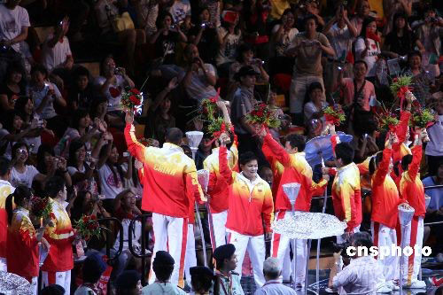图为运动员乘坐莲花车入场,受到热烈欢迎。中新社发 洪少葵 摄