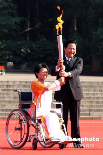 九月二日上午,北京残奥圣火来到古都南京,受到民众的热烈欢迎。图为江苏省委书记梁保华将火炬传递给火炬手。 中新社发 牛莉 摄