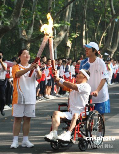 九月二日上午,北京残奥会圣火来到古都南京,受到民众的热烈欢迎,图为火炬手进行火炬传递。中新社发 牛莉 摄