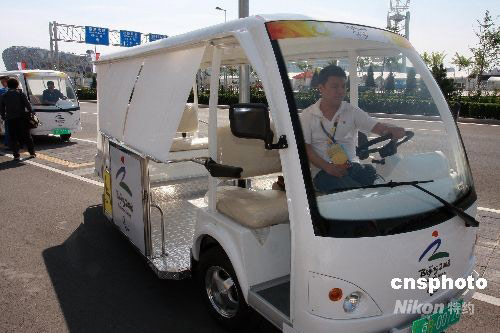 9月2日,一批新型的无障碍电瓶车北京奥运村“上岗”。据悉,从8月10日起,50辆无障碍电瓶车在奥林匹克公园公共区“上岗”,并将使用到残奥会结束。残奥会期间,老年人、残疾人到“鸟巢”、“水立方”等场馆观看比赛,可不必担心行动不便带来的问题。每辆电瓶车可提供轮椅服务,同时配备一名观众服务志愿者,全程为行动不便的观众提供服务。中新社发 郑雄增 摄
