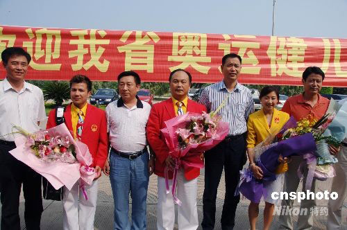 9月3日下午,继港、澳行活动之后,奥运会男子举重62公斤级冠军张湘祥(左二)、中国男子举重队总教练陈文斌(左四)、奥运会女子蹦床冠军何雯娜(右四)、中国女排总教练陈忠和等福建籍健儿,当日,从北京乘航班抵达福州,受到家乡父老乡亲的热烈欢迎。 中新社发 郑祚声 摄