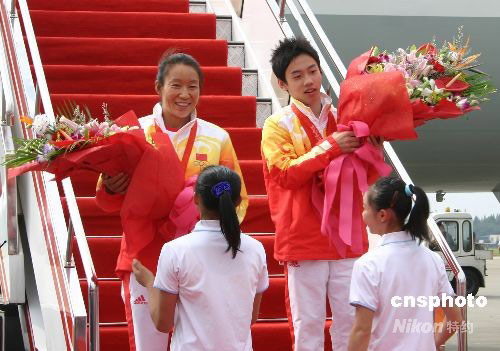 9月3日15时30分,北京奥运会冠军邹凯、殷剑在家乡人民的热烈欢迎中回到了四川。在2008北京奥运会上,来自四川泸州的邹凯勇夺自由体操、单杠、男子体操团体三枚金牌,来自凉山的殷剑为中国代表团拿下了第一枚奥运会帆船金牌。中新社发 霍潺 摄