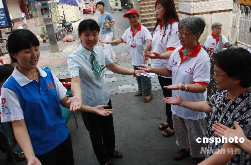 9月3日,北京市民在东四邮局门口与志愿者们一起学习手语“北京欢迎你”,迎接即将来临的残奥盛会。这一天,是北京残奥会志愿服务的行动日。中新社发 郑雄增 摄