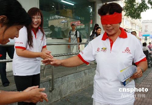 残奥会志愿服务行动日 北京市民街头体验盲道