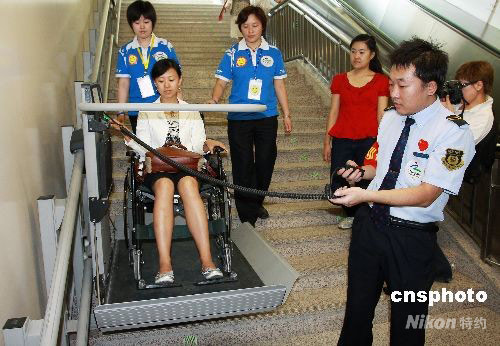 图为志愿者在北京灯市口地铁站点进行残奥会前的最后热身(演练)。