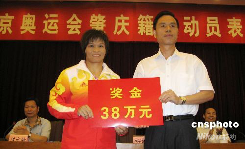 九月四日下午,广东肇庆隆重举行表彰大会,百万重金重奖该市参加第二十九届北京奥运会的肇庆藉运动员,其中,“妈妈冠军”冼东妹共获三十九万五千元人民币的奖励。在北京奥运上,肇庆藉共输送了女子柔道、赛艇、皮艇等项目运动员四人。其中,女子柔道五十二公斤级运动员卫冕冠军,成为名扬天下的“妈妈冠军”。