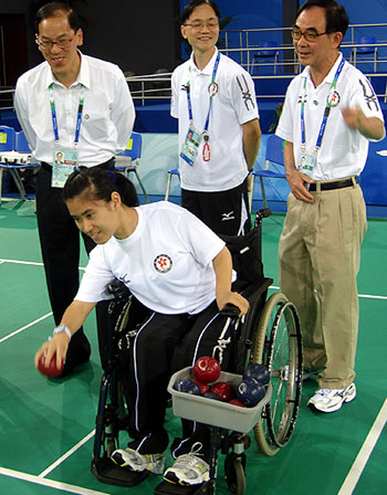 民政事务局局长曾德成(左)观看香港硬地滚球队进行赛前的操练。(图片来源:香港特区政府网站)