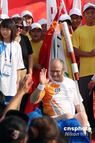 火炬手、国际残奥委会(IPC)主席菲利普·克雷文(Philip Craven)传递火炬。中新社发 张宇 摄