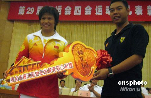 九月五日下午,广东肇庆隆重举行表彰大会,百万重金重奖该市参加第二十九届北京奥运会的肇庆藉运动员,其中,“妈妈冠军”冼东妹共获三十九万五千元人民币的奖励,当地臻汇园物业发展有限公司向冼东妹赠送了一套价值五十万元人民的洋房。据了解,在北京奥运上,肇庆藉共输送了女子柔道、赛艇、皮艇等项目运动员四人。其中,女子柔道五十二公斤级运动员卫冕冠军,成为名扬天下的“妈妈冠军”。中新社发 黄耀辉 摄