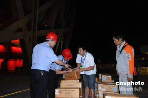 将在九月六日晚上演的残奥会开幕式,主会场鸟巢将呈现宇宙星光的绮丽场景,焰火将打出流星等特殊星光造型,让观众沿着流光溢彩的星光大道,步入北京残奥会的“欢乐时空”。目前,鸟巢烟花已经全部准备就绪。图为工作人员在残奥会开幕前夕在鸟巢安装烟花。中新社发 熊迪 摄
